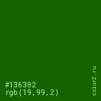 Цвет #136302 в цветовой модели RGB обозначается тремя октетами (19, 99, 2) в десятичном формате и #136302 в шестнадцатиричном (hex) формате, которые являются интенсивностью красного 19 (hex 13), интенсивность зелёного 99 (hex 63) и интенсивность синего 2 (hex 02).