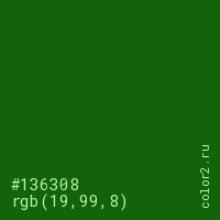 Цвет #136308 в цветовой модели RGB обозначается тремя октетами (19, 99, 8) в десятичном формате и #136308 в шестнадцатиричном (hex) формате, которые являются интенсивностью красного 19 (hex 13), интенсивность зелёного 99 (hex 63) и интенсивность синего 8 (hex 08).