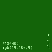 Цвет #136409 в цветовой модели RGB обозначается тремя октетами (19, 100, 9) в десятичном формате и #136409 в шестнадцатиричном (hex) формате, которые являются интенсивностью красного 19 (hex 13), интенсивность зелёного 100 (hex 64) и интенсивность синего 9 (hex 09).