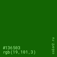 Цвет #136503 в цветовой модели RGB обозначается тремя октетами (19, 101, 3) в десятичном формате и #136503 в шестнадцатиричном (hex) формате, которые являются интенсивностью красного 19 (hex 13), интенсивность зелёного 101 (hex 65) и интенсивность синего 3 (hex 03).
