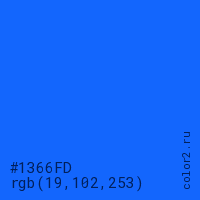 Цвет #1366FD в цветовой модели RGB обозначается тремя октетами (19, 102, 253) в десятичном формате и #1366FD в шестнадцатиричном (hex) формате, которые являются интенсивностью красного 19 (hex 13), интенсивность зелёного 102 (hex 66) и интенсивность синего 253 (hex FD).