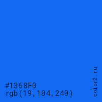 Цвет #1368F0 в цветовой модели RGB обозначается тремя октетами (19, 104, 240) в десятичном формате и #1368F0 в шестнадцатиричном (hex) формате, которые являются интенсивностью красного 19 (hex 13), интенсивность зелёного 104 (hex 68) и интенсивность синего 240 (hex F0).