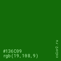 Цвет #136C09 в цветовой модели RGB обозначается тремя октетами (19, 108, 9) в десятичном формате и #136C09 в шестнадцатиричном (hex) формате, которые являются интенсивностью красного 19 (hex 13), интенсивность зелёного 108 (hex 6C) и интенсивность синего 9 (hex 09).