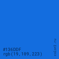 Цвет #136DDF в цветовой модели RGB обозначается тремя октетами (19, 109, 223) в десятичном формате и #136DDF в шестнадцатиричном (hex) формате, которые являются интенсивностью красного 19 (hex 13), интенсивность зелёного 109 (hex 6D) и интенсивность синего 223 (hex DF).