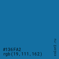 Цвет #136FA2 в цветовой модели RGB обозначается тремя октетами (19, 111, 162) в десятичном формате и #136FA2 в шестнадцатиричном (hex) формате, которые являются интенсивностью красного 19 (hex 13), интенсивность зелёного 111 (hex 6F) и интенсивность синего 162 (hex A2).
