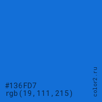 Цвет #136FD7 в цветовой модели RGB обозначается тремя октетами (19, 111, 215) в десятичном формате и #136FD7 в шестнадцатиричном (hex) формате, которые являются интенсивностью красного 19 (hex 13), интенсивность зелёного 111 (hex 6F) и интенсивность синего 215 (hex D7).