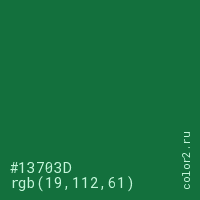 Цвет #13703D в цветовой модели RGB обозначается тремя октетами (19, 112, 61) в десятичном формате и #13703D в шестнадцатиричном (hex) формате, которые являются интенсивностью красного 19 (hex 13), интенсивность зелёного 112 (hex 70) и интенсивность синего 61 (hex 3D).