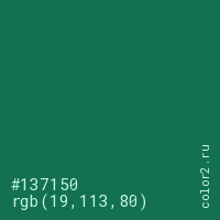 Цвет #137150 в цветовой модели RGB обозначается тремя октетами (19, 113, 80) в десятичном формате и #137150 в шестнадцатиричном (hex) формате, которые являются интенсивностью красного 19 (hex 13), интенсивность зелёного 113 (hex 71) и интенсивность синего 80 (hex 50).