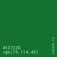 Цвет #13722D в цветовой модели RGB обозначается тремя октетами (19, 114, 45) в десятичном формате и #13722D в шестнадцатиричном (hex) формате, которые являются интенсивностью красного 19 (hex 13), интенсивность зелёного 114 (hex 72) и интенсивность синего 45 (hex 2D).