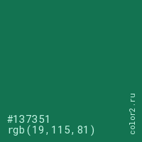 Цвет #137351 в цветовой модели RGB обозначается тремя октетами (19, 115, 81) в десятичном формате и #137351 в шестнадцатиричном (hex) формате, которые являются интенсивностью красного 19 (hex 13), интенсивность зелёного 115 (hex 73) и интенсивность синего 81 (hex 51).