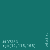 Цвет #13736C в цветовой модели RGB обозначается тремя октетами (19, 115, 108) в десятичном формате и #13736C в шестнадцатиричном (hex) формате, которые являются интенсивностью красного 19 (hex 13), интенсивность зелёного 115 (hex 73) и интенсивность синего 108 (hex 6C).