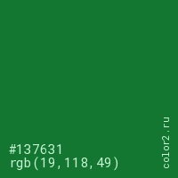 Цвет #137631 в цветовой модели RGB обозначается тремя октетами (19, 118, 49) в десятичном формате и #137631 в шестнадцатиричном (hex) формате, которые являются интенсивностью красного 19 (hex 13), интенсивность зелёного 118 (hex 76) и интенсивность синего 49 (hex 31).