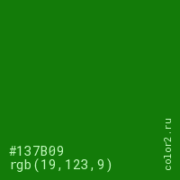 Цвет #137B09 в цветовой модели RGB обозначается тремя октетами (19, 123, 9) в десятичном формате и #137B09 в шестнадцатиричном (hex) формате, которые являются интенсивностью красного 19 (hex 13), интенсивность зелёного 123 (hex 7B) и интенсивность синего 9 (hex 09).