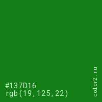 Цвет #137D16 в цветовой модели RGB обозначается тремя октетами (19, 125, 22) в десятичном формате и #137D16 в шестнадцатиричном (hex) формате, которые являются интенсивностью красного 19 (hex 13), интенсивность зелёного 125 (hex 7D) и интенсивность синего 22 (hex 16).