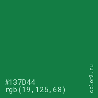 Цвет #137D44 в цветовой модели RGB обозначается тремя октетами (19, 125, 68) в десятичном формате и #137D44 в шестнадцатиричном (hex) формате, которые являются интенсивностью красного 19 (hex 13), интенсивность зелёного 125 (hex 7D) и интенсивность синего 68 (hex 44).