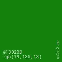 Цвет #13820D в цветовой модели RGB обозначается тремя октетами (19, 130, 13) в десятичном формате и #13820D в шестнадцатиричном (hex) формате, которые являются интенсивностью красного 19 (hex 13), интенсивность зелёного 130 (hex 82) и интенсивность синего 13 (hex 0D).