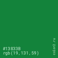 Цвет #13833B в цветовой модели RGB обозначается тремя октетами (19, 131, 59) в десятичном формате и #13833B в шестнадцатиричном (hex) формате, которые являются интенсивностью красного 19 (hex 13), интенсивность зелёного 131 (hex 83) и интенсивность синего 59 (hex 3B).