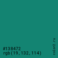 Цвет #138472 в цветовой модели RGB обозначается тремя октетами (19, 132, 114) в десятичном формате и #138472 в шестнадцатиричном (hex) формате, которые являются интенсивностью красного 19 (hex 13), интенсивность зелёного 132 (hex 84) и интенсивность синего 114 (hex 72).
