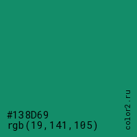 Цвет #138D69 в цветовой модели RGB обозначается тремя октетами (19, 141, 105) в десятичном формате и #138D69 в шестнадцатиричном (hex) формате, которые являются интенсивностью красного 19 (hex 13), интенсивность зелёного 141 (hex 8D) и интенсивность синего 105 (hex 69).
