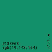 Цвет #138F68 в цветовой модели RGB обозначается тремя октетами (19, 143, 104) в десятичном формате и #138F68 в шестнадцатиричном (hex) формате, которые являются интенсивностью красного 19 (hex 13), интенсивность зелёного 143 (hex 8F) и интенсивность синего 104 (hex 68).