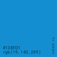 Цвет #138FD1 в цветовой модели RGB обозначается тремя октетами (19, 143, 209) в десятичном формате и #138FD1 в шестнадцатиричном (hex) формате, которые являются интенсивностью красного 19 (hex 13), интенсивность зелёного 143 (hex 8F) и интенсивность синего 209 (hex D1).
