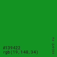 Цвет #139422 в цветовой модели RGB обозначается тремя октетами (19, 148, 34) в десятичном формате и #139422 в шестнадцатиричном (hex) формате, которые являются интенсивностью красного 19 (hex 13), интенсивность зелёного 148 (hex 94) и интенсивность синего 34 (hex 22).