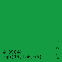 Цвет #139C41 в цветовой модели RGB обозначается тремя октетами (19, 156, 65) в десятичном формате и #139C41 в шестнадцатиричном (hex) формате, которые являются интенсивностью красного 19 (hex 13), интенсивность зелёного 156 (hex 9C) и интенсивность синего 65 (hex 41).