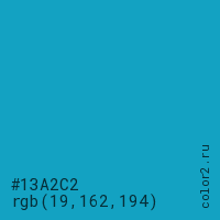 Цвет #13A2C2 в цветовой модели RGB обозначается тремя октетами (19, 162, 194) в десятичном формате и #13A2C2 в шестнадцатиричном (hex) формате, которые являются интенсивностью красного 19 (hex 13), интенсивность зелёного 162 (hex A2) и интенсивность синего 194 (hex C2).