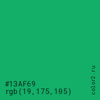 Цвет #13AF69 в цветовой модели RGB обозначается тремя октетами (19, 175, 105) в десятичном формате и #13AF69 в шестнадцатиричном (hex) формате, которые являются интенсивностью красного 19 (hex 13), интенсивность зелёного 175 (hex AF) и интенсивность синего 105 (hex 69).