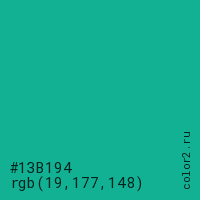 Цвет #13B194 в цветовой модели RGB обозначается тремя октетами (19, 177, 148) в десятичном формате и #13B194 в шестнадцатиричном (hex) формате, которые являются интенсивностью красного 19 (hex 13), интенсивность зелёного 177 (hex B1) и интенсивность синего 148 (hex 94).