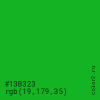 Цвет #13B323 в цветовой модели RGB обозначается тремя октетами (19, 179, 35) в десятичном формате и #13B323 в шестнадцатиричном (hex) формате, которые являются интенсивностью красного 19 (hex 13), интенсивность зелёного 179 (hex B3) и интенсивность синего 35 (hex 23).