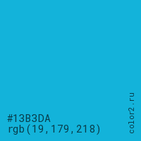 Цвет #13B3DA в цветовой модели RGB обозначается тремя октетами (19, 179, 218) в десятичном формате и #13B3DA в шестнадцатиричном (hex) формате, которые являются интенсивностью красного 19 (hex 13), интенсивность зелёного 179 (hex B3) и интенсивность синего 218 (hex DA).