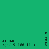 Цвет #13B46F в цветовой модели RGB обозначается тремя октетами (19, 180, 111) в десятичном формате и #13B46F в шестнадцатиричном (hex) формате, которые являются интенсивностью красного 19 (hex 13), интенсивность зелёного 180 (hex B4) и интенсивность синего 111 (hex 6F).