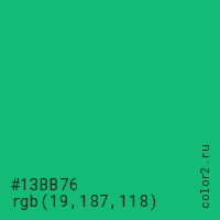 Цвет #13BB76 в цветовой модели RGB обозначается тремя октетами (19, 187, 118) в десятичном формате и #13BB76 в шестнадцатиричном (hex) формате, которые являются интенсивностью красного 19 (hex 13), интенсивность зелёного 187 (hex BB) и интенсивность синего 118 (hex 76).