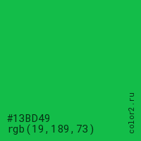Цвет #13BD49 в цветовой модели RGB обозначается тремя октетами (19, 189, 73) в десятичном формате и #13BD49 в шестнадцатиричном (hex) формате, которые являются интенсивностью красного 19 (hex 13), интенсивность зелёного 189 (hex BD) и интенсивность синего 73 (hex 49).