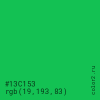 Цвет #13C153 в цветовой модели RGB обозначается тремя октетами (19, 193, 83) в десятичном формате и #13C153 в шестнадцатиричном (hex) формате, которые являются интенсивностью красного 19 (hex 13), интенсивность зелёного 193 (hex C1) и интенсивность синего 83 (hex 53).