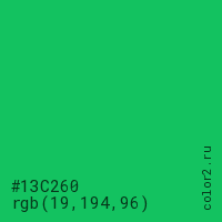 Цвет #13C260 в цветовой модели RGB обозначается тремя октетами (19, 194, 96) в десятичном формате и #13C260 в шестнадцатиричном (hex) формате, которые являются интенсивностью красного 19 (hex 13), интенсивность зелёного 194 (hex C2) и интенсивность синего 96 (hex 60).