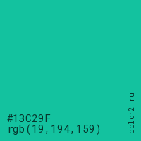 Цвет #13C29F в цветовой модели RGB обозначается тремя октетами (19, 194, 159) в десятичном формате и #13C29F в шестнадцатиричном (hex) формате, которые являются интенсивностью красного 19 (hex 13), интенсивность зелёного 194 (hex C2) и интенсивность синего 159 (hex 9F).