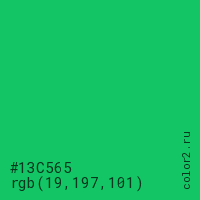 Цвет #13C565 в цветовой модели RGB обозначается тремя октетами (19, 197, 101) в десятичном формате и #13C565 в шестнадцатиричном (hex) формате, которые являются интенсивностью красного 19 (hex 13), интенсивность зелёного 197 (hex C5) и интенсивность синего 101 (hex 65).