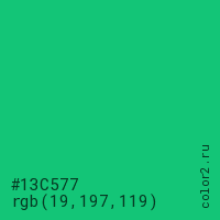 Цвет #13C577 в цветовой модели RGB обозначается тремя октетами (19, 197, 119) в десятичном формате и #13C577 в шестнадцатиричном (hex) формате, которые являются интенсивностью красного 19 (hex 13), интенсивность зелёного 197 (hex C5) и интенсивность синего 119 (hex 77).