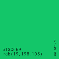 Цвет #13C669 в цветовой модели RGB обозначается тремя октетами (19, 198, 105) в десятичном формате и #13C669 в шестнадцатиричном (hex) формате, которые являются интенсивностью красного 19 (hex 13), интенсивность зелёного 198 (hex C6) и интенсивность синего 105 (hex 69).