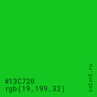 Цвет #13C720 в цветовой модели RGB обозначается тремя октетами (19, 199, 32) в десятичном формате и #13C720 в шестнадцатиричном (hex) формате, которые являются интенсивностью красного 19 (hex 13), интенсивность зелёного 199 (hex C7) и интенсивность синего 32 (hex 20).