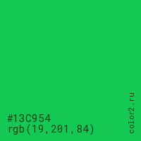 Цвет #13C954 в цветовой модели RGB обозначается тремя октетами (19, 201, 84) в десятичном формате и #13C954 в шестнадцатиричном (hex) формате, которые являются интенсивностью красного 19 (hex 13), интенсивность зелёного 201 (hex C9) и интенсивность синего 84 (hex 54).