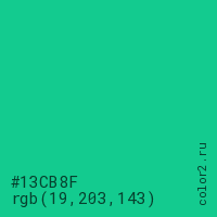Цвет #13CB8F в цветовой модели RGB обозначается тремя октетами (19, 203, 143) в десятичном формате и #13CB8F в шестнадцатиричном (hex) формате, которые являются интенсивностью красного 19 (hex 13), интенсивность зелёного 203 (hex CB) и интенсивность синего 143 (hex 8F).