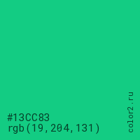 Цвет #13CC83 в цветовой модели RGB обозначается тремя октетами (19, 204, 131) в десятичном формате и #13CC83 в шестнадцатиричном (hex) формате, которые являются интенсивностью красного 19 (hex 13), интенсивность зелёного 204 (hex CC) и интенсивность синего 131 (hex 83).