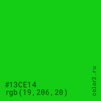 Цвет #13CE14 в цветовой модели RGB обозначается тремя октетами (19, 206, 20) в десятичном формате и #13CE14 в шестнадцатиричном (hex) формате, которые являются интенсивностью красного 19 (hex 13), интенсивность зелёного 206 (hex CE) и интенсивность синего 20 (hex 14).