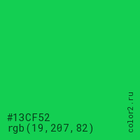 Цвет #13CF52 в цветовой модели RGB обозначается тремя октетами (19, 207, 82) в десятичном формате и #13CF52 в шестнадцатиричном (hex) формате, которые являются интенсивностью красного 19 (hex 13), интенсивность зелёного 207 (hex CF) и интенсивность синего 82 (hex 52).