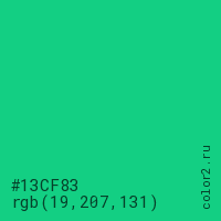 Цвет #13CF83 в цветовой модели RGB обозначается тремя октетами (19, 207, 131) в десятичном формате и #13CF83 в шестнадцатиричном (hex) формате, которые являются интенсивностью красного 19 (hex 13), интенсивность зелёного 207 (hex CF) и интенсивность синего 131 (hex 83).