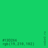 Цвет #13D266 в цветовой модели RGB обозначается тремя октетами (19, 210, 102) в десятичном формате и #13D266 в шестнадцатиричном (hex) формате, которые являются интенсивностью красного 19 (hex 13), интенсивность зелёного 210 (hex D2) и интенсивность синего 102 (hex 66).