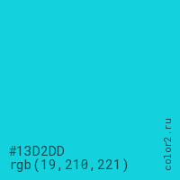 Цвет #13D2DD в цветовой модели RGB обозначается тремя октетами (19, 210, 221) в десятичном формате и #13D2DD в шестнадцатиричном (hex) формате, которые являются интенсивностью красного 19 (hex 13), интенсивность зелёного 210 (hex D2) и интенсивность синего 221 (hex DD).